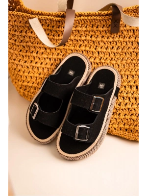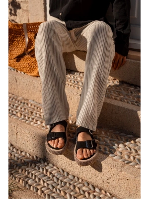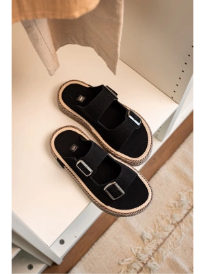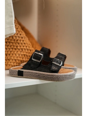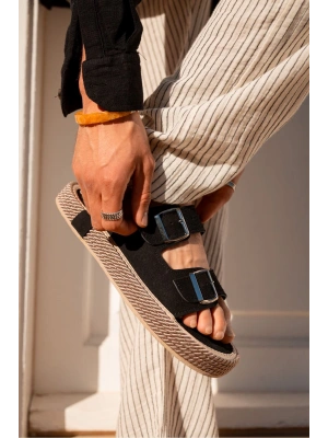 Francesco Siyah Çift Tokalı El Yapımı Natural Hasır Erkek Terlik