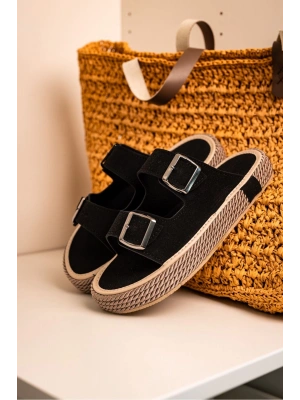 Francesco Siyah Süet Çift Tokalı El Yapımı Natural Hasır Erkek Terlik